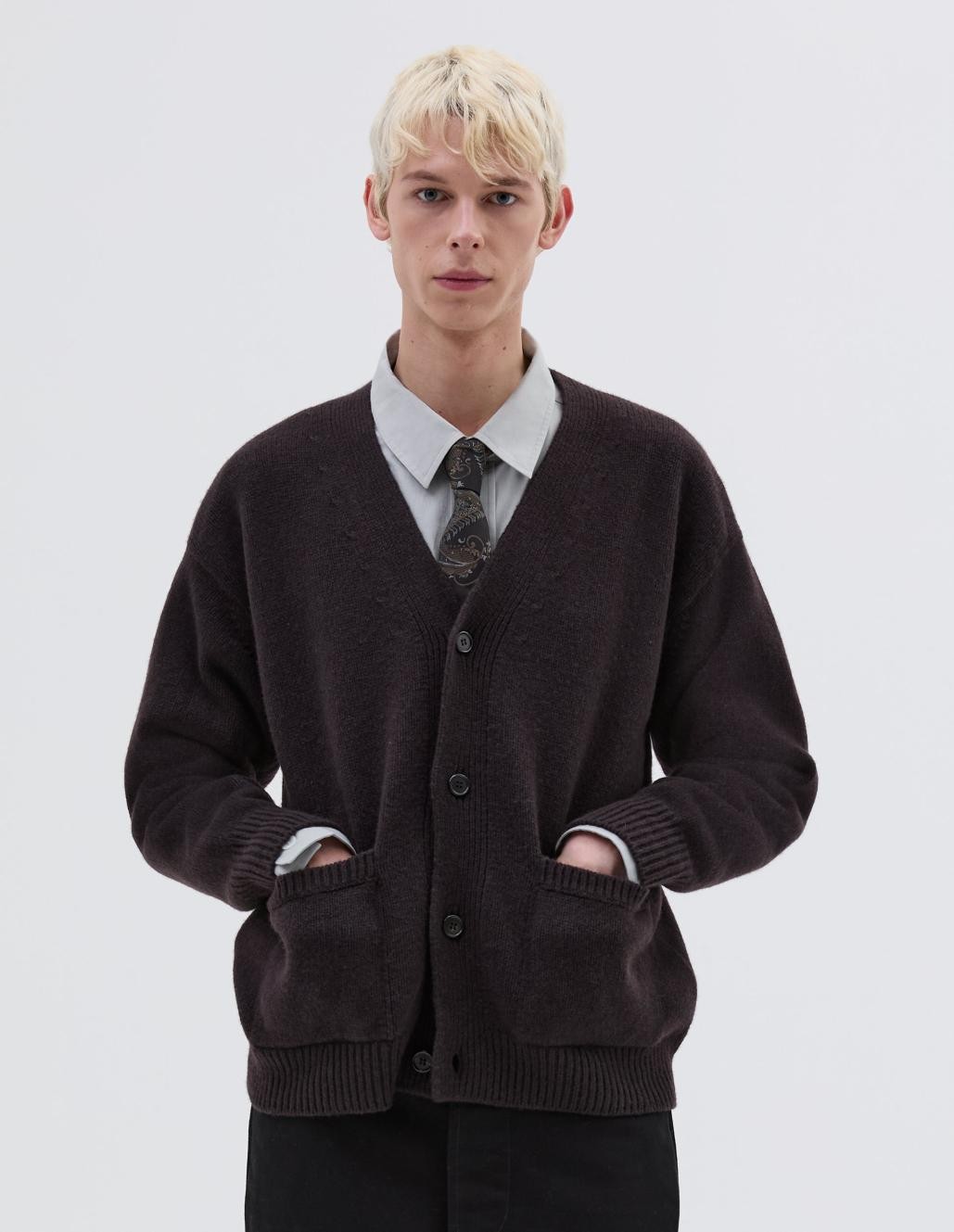 Cardigan ample. Coupe oversize. Poches plaquées avec détails côtelés contrastés. Bord-côtes contrastés aux poignets et à l'ourlet. Tricoté en laine Geelong filée britannique mi-lourde, douce au toucher.