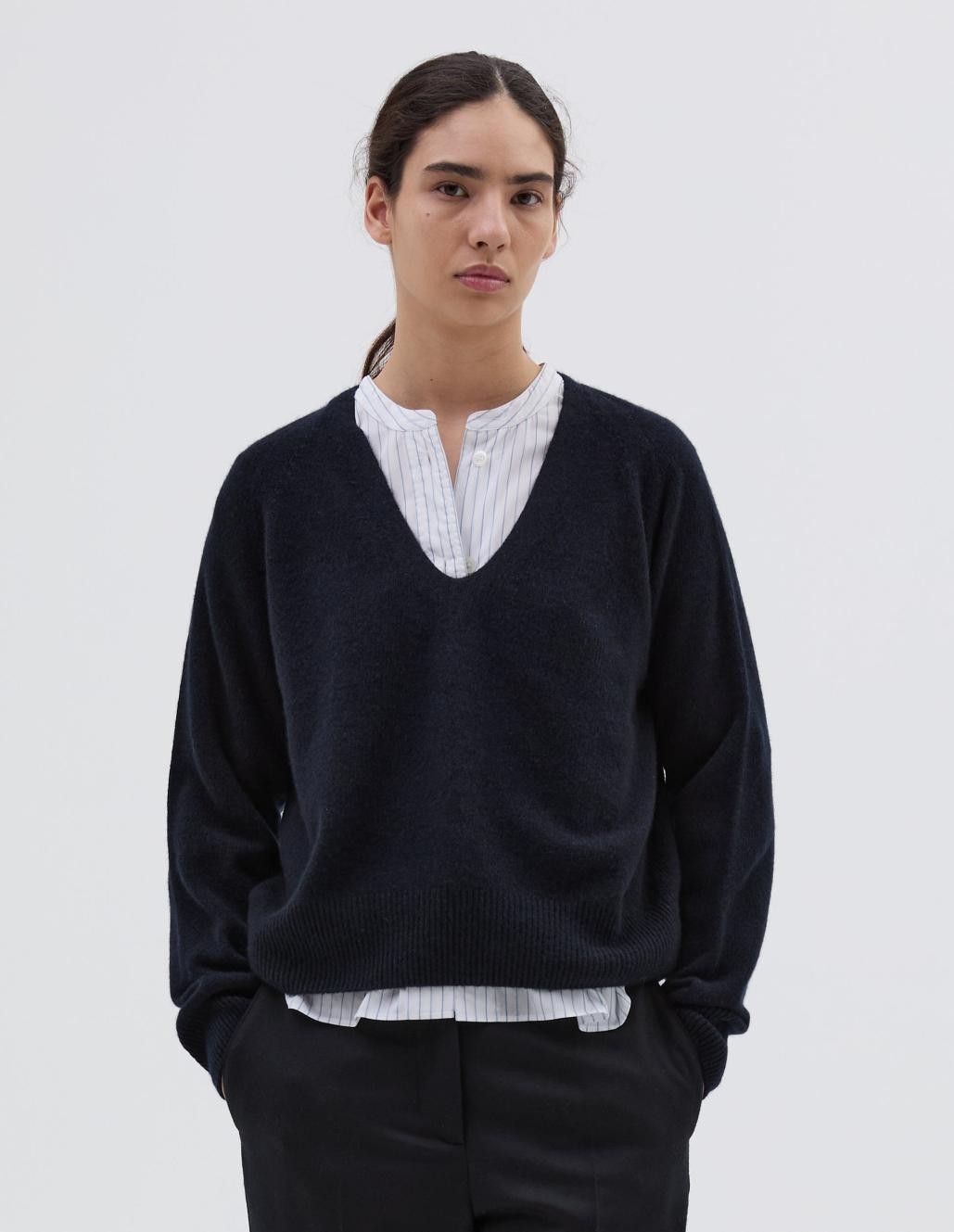 Muineál V Bearrtha le Casadh Cabhlach Dorcha | Éadaí Cniotáilte Margaret Howell do Mhná