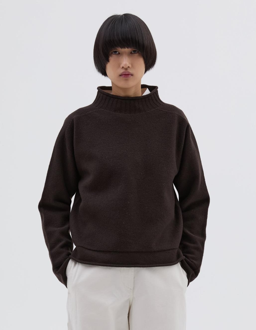 GUERNSEY INFELTRATO. SENZA CUCITURE. VESTIBILITÀ BOXY. POLSINI E ORLO CON BORDO ARROTOLATO. LAVORATO A MAGLIA IN LANA INFELTRATA ITALIANA DI PESO MEDIO.