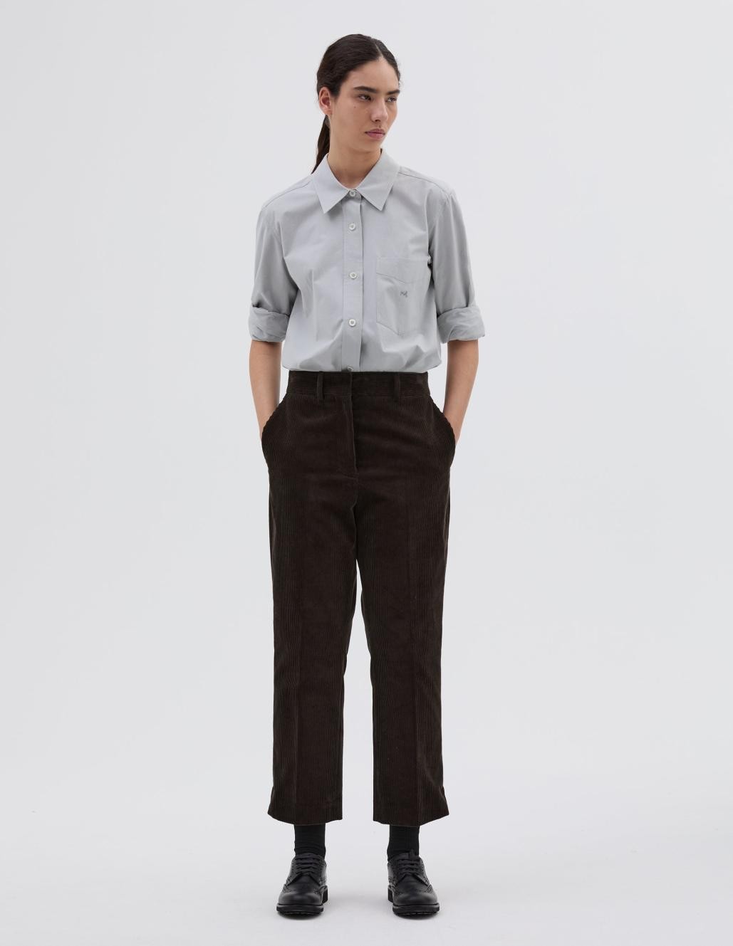 ミディウエストのクロップドパンツ。スリムカット。フックとバーで留めるジップフライ。ベルトループ付き。バータックのディテールが施されたサイドポケット。サイドスリットヘム。ボタン留めのジェットバックポケット。柔らかな手触りのイタリア製コットンコーデュロイを使用。
