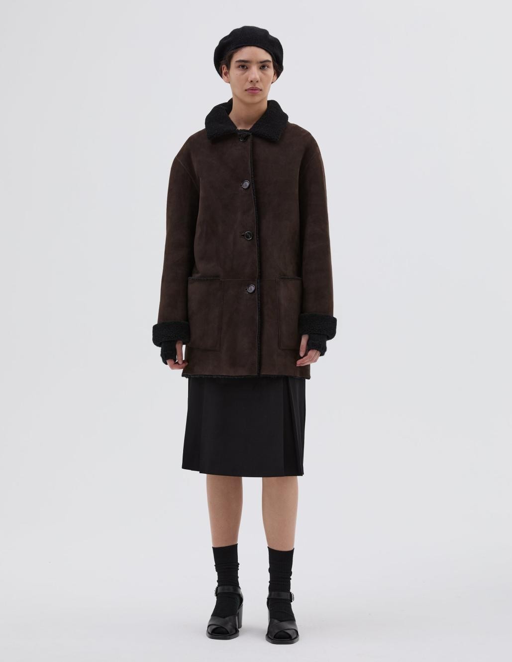 シアリングカーコート。オーバーサイズカット。襟にストームタブ。パッチポケット。中厚スペイン産シアリングを使用。