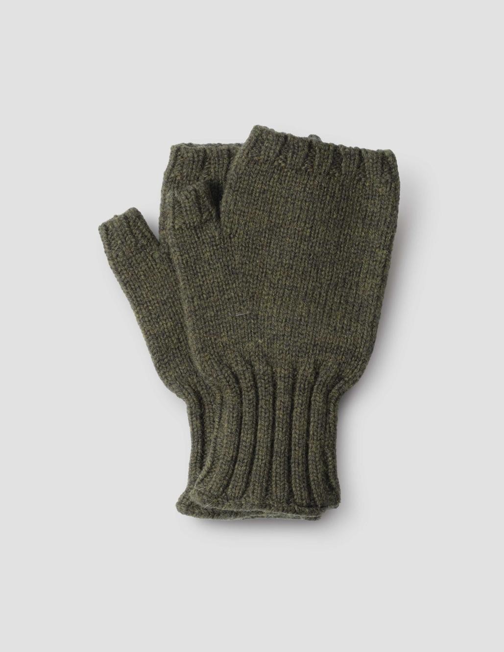 フィンガーレスグローブ。長めのリブ編みの袖口。端はカットオフ仕上げ。