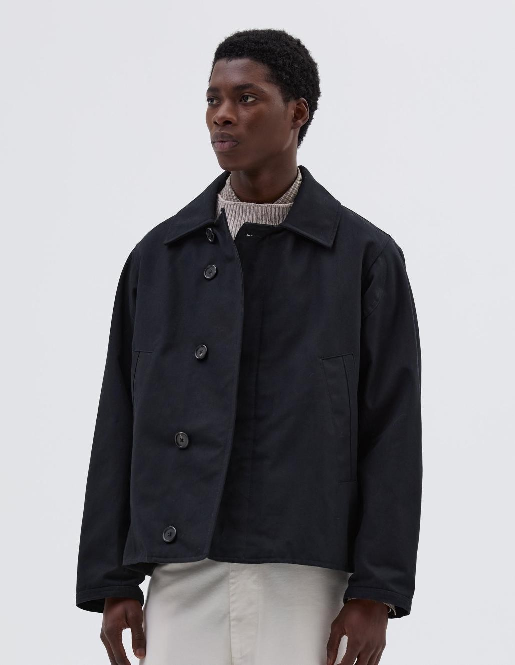 ネイビージャケット。中綿入り。クロップド丈、ボックスフィット。ウェルトポケット。サイドアジャスター。内側にジェットポケット。厚手のベンタイルキャンバス製。