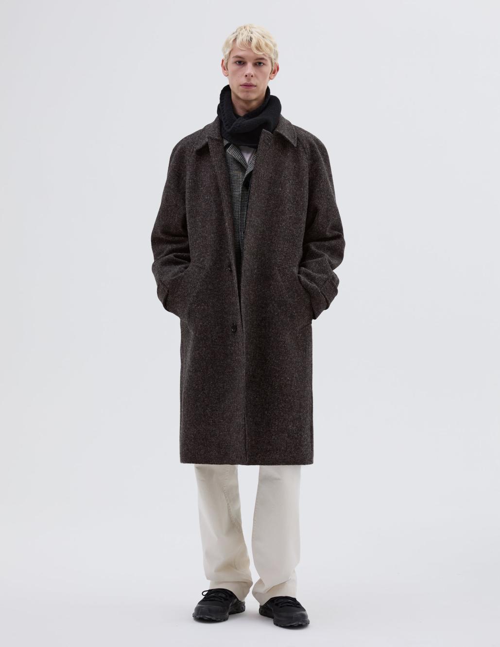 RAGLAN JAS. ONTSPANNEN SNIT. KNOOPSLUITING VOORAAN MET ZICHTBARE BOVENKNOOP. SCHUINE DIEPE PASZAKKEN. VERSTELBARE MANCHETTEN MET KNOOPLIPJES. OPENING IN HET MIDDEN ACHTER MET VERBORGEN KNOOPSLUITING. SLUITING MET KNOOPLUSSEN EN PASVORM IN DE BINNENZAKKEN. GEMAAKT VAN MIDEIGHT WOL, GEWEVEN IN ENGELAND DOOR HARRIS TWEED.