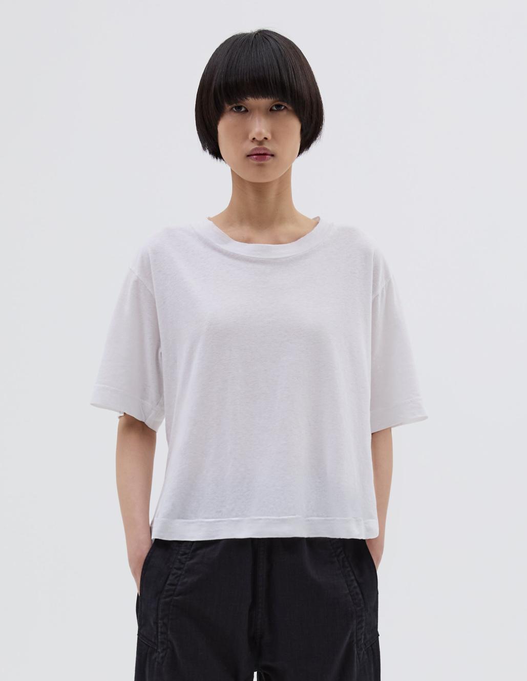 EENVOUDIG T-SHIRT VAN LICHTGEWICHT KATOENEN LINNEN JERSEY. RELAXTE PASVORM. GEVERFD. CONTRASTERENDE RIBBEN HALS. STIEKDETAILS OP DE SCHOUDER.