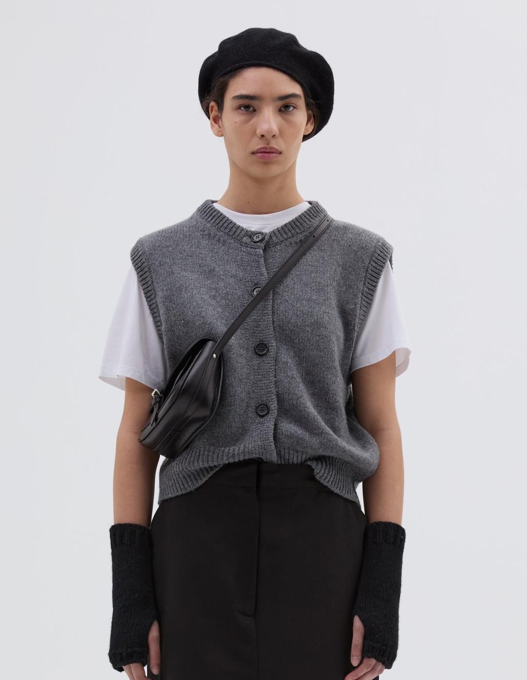 VESTĂ TRICOTATĂ. CROIALĂ LIXĂ. FEȚĂ CU CUSĂTURĂ MILANO ÎN CONTRAST. CU RIȘURI ÎN CONTRAST PE GÂT, LA BRAȚĂ ȘI LA TAVĂ. TRICOTATĂ DINTR-UN AMESTEC ITALIAN DE LÂNĂ MERINO ȘI CASHMER, CU O TUȘARE MOALE LA MÂNĂ.