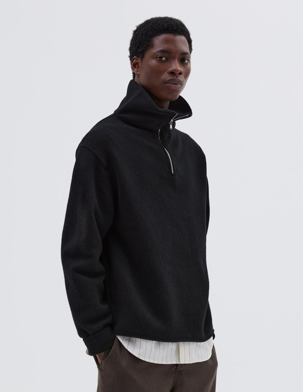 SVETER S POLOVIČNÝM ZIPSOM. ŠIROKÝ STRIH. STOJAČKOVÝ GOLIER. SKRYTÉ BOČNÉ VRECKÁ. ROVNÁ MANŽETA A LEM. ÚPLETENÝ ZO STREDNE HMOTNEJ BRITSKEJ VLNY GEELONG.